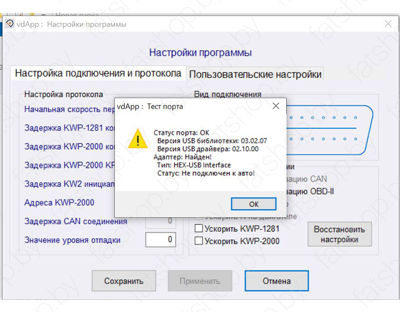 подключаем адаптер Вася к компьютеру и автомобилю, включаем зажигание нажимаем "Тест". После появиться информационное окно, нажимаем "Ок" и далее "Сохранить".