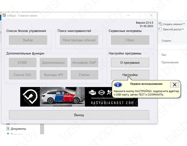 6. Если драйвер установлен верно, то можно запускать программу для окончания настройки. Запускаем ярлык " ВАСЯ Диагност 23.5.0 " с рабочего стола. Переходим в "Настройки",