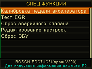 - Спец. функции - режим включает разнообразные настройки параметров работы диагностируемой системы*: регулировка оборотов ХХ, настройка ограничения скорости, сброс моточасов, калибровка педали газа, сброс адаптаций ЭБУ, запись кодов (кодирование) форсунок и т. п. По нажатию кнопки F2 на дисплей прибора выводится расширенное описание выбранной спец. функции и условия выполнения. (Перечень специальных функций зависит от диагностируемого автомобиля/двигателя/системы, типа ЭБУ и его прошивки, см. таблицу столбец «Спец. функции»)