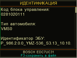 - Идентификация - режим позволяет прочитать и показать на дисплее прибора идентификационные данные ЭБУ диагностируемой системы (заводской номер ЭБУ, версию прошивки и т.д.). Считанные идентификационные данные можно сохранить в виде текстового файла на SD-карте прибора.