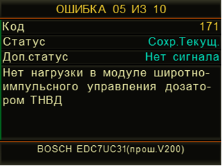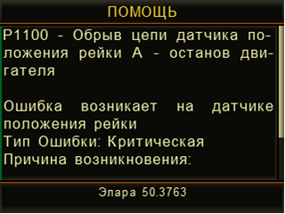 - Считывание, расшифровка и стирание кодов неисправностей - в этом режиме осуществляется считывание и обнуление кодов неисправностей (ошибок) регистрируемых ЭБУ диагностируемой системы. На экран выводятся цифровые коды ошибок, статус обнаруженных ошибок (текущие, сохраненные) и их расшифровка. По нажатию функциональной кнопки F2 на дисплее прибора отображается полный текст кода неисправности и справочная информация по поиску и устранению неисправности (справочная информация по поиску и устранению неисправностей доступна не для всех кодов ошибок. Рекомендуется использовать документацию производителя диагностируемой системы/двигателя)