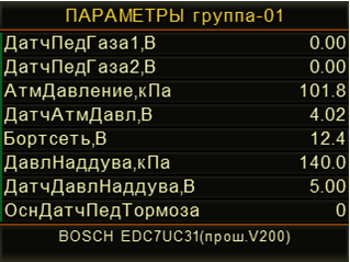 - Параметры – просмотр текущих параметров работы диагностируемой системы. Одновременно на дисплее прибора могут отображаться до 8 параметров. Пользователи прибора могут создавать и сохранять свой группы параметров для отображения. Для каждого параметра на дисплей прибора можно вызвать его расширенное описание.