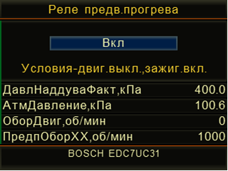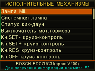 - Исполнительные механизмы - режим предназначен для проверки работоспособности исполнительных механизмов (ИМ) диагностируемой системы и, в некоторых случаях, для настройки нового значения. По нажатию кнопки F2 на дисплее прибора отображается расширенное описание выбранного ИМ, особенности управления и условия, которые необходимо соблюдать при управлении ИМ.