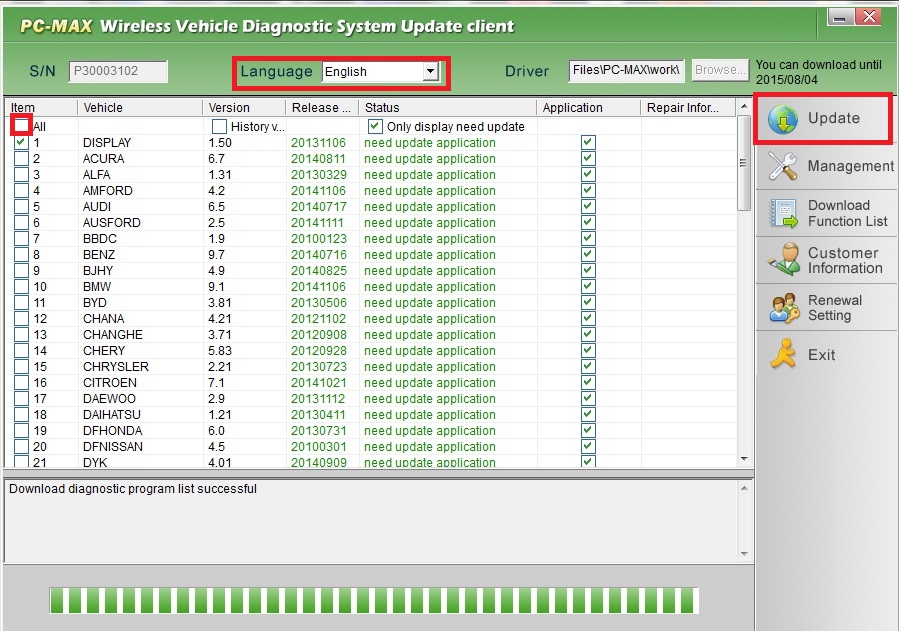 - запускаем PC-MAXClient.exe из PC-MAX Update Client, нажимаем manual update, выбираем язык (лучше сначала английский, потом русский), ставим галочку "all" слева, нажимаем update. Английские версии обычно новее русских
