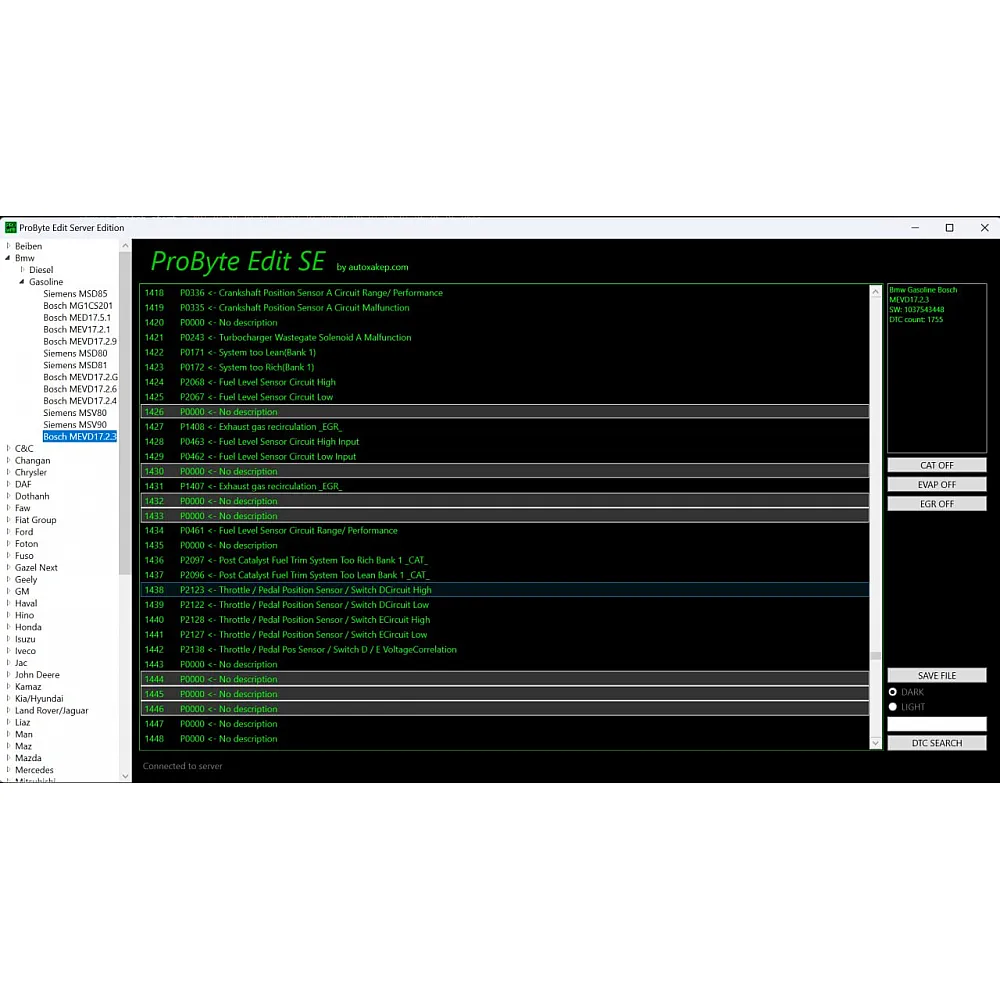Probyte Edit Bmw Gasoline Bosch MEVD17.2.3 EGR CAT DTC — это лицензия на программное обеспечение, которое предназначено для работы с бензиновыми двигателями BMW. Оно поддерживает системы EGR, CAT и DTC, а также совместимо с контроллерами Bosch MEVD17.2.3. С помощью этой программы можно эффективно редактировать параметры двигателя, что позволяет оптимизировать его работу и улучшить эксплуатационные характеристики. Подходит для профессионального использования в автосервисах и мастерских.