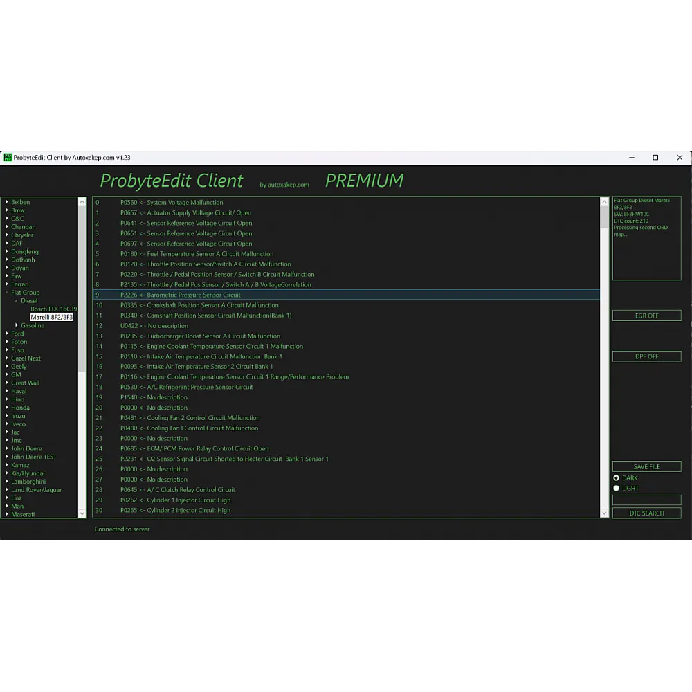 Probyte Edit Fiat Group Diesel Marelli 8F2/8F3 EGR DPF DTC OFF — это лицензионное программное обеспечение, предназначенное для работы с дизельными автомобилями Fiat Group, оснащёнными системами Marelli 8F2 и 8F3. Программа позволяет проводить настройку и диагностику электронных систем управления двигателем, а также деактивировать функции EGR (рециркуляция выхлопных газов), DPF (сажевый фильтр) и DTC (система контроля тяги). Подходит для профессиональных автомехаников и сервисных центров, работающих с автомобилями Fiat, Chrysler, Alfa Romeo и другими моделями, использующими указанные системы управления двигателем.