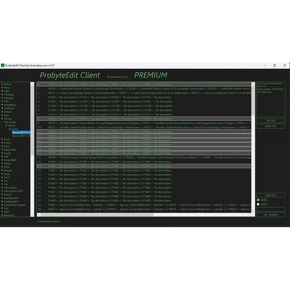 Probyte Edit Fiat Group Gasoline Bosch ME7.9.10 CAT EVAP EGR DTC — это лицензионное программное обеспечение, предназначенное для работы с автомобилями Fiat Group, оснащёнными бензиновыми двигателями и контроллерами Bosch ME7.9.10. Программа позволяет выполнять комплексную диагностику, настройку и обслуживание систем управления двигателем, включая системы EVAP, EGR и DTC. Подходит для профессионалов в области автомобильного сервиса и ремонта.