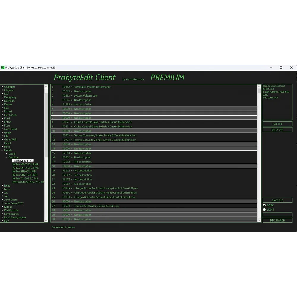 Probyte Edit Honda Gasoline Bosch MED17.9.3 CAT EVAP DTC OFF — это лицензионное программное обеспечение, предназначенное для работы с автомобилями Honda с бензиновыми двигателями и системой управления Bosch MED17.9.3. Программа позволяет проводить диагностику, настройку и обслуживание электронных систем автомобиля, включая управление каталитическим нейтрализатором (CAT), системой улавливания паров топлива (EVAP) и отключением кодов неисправностей (DTC OFF).