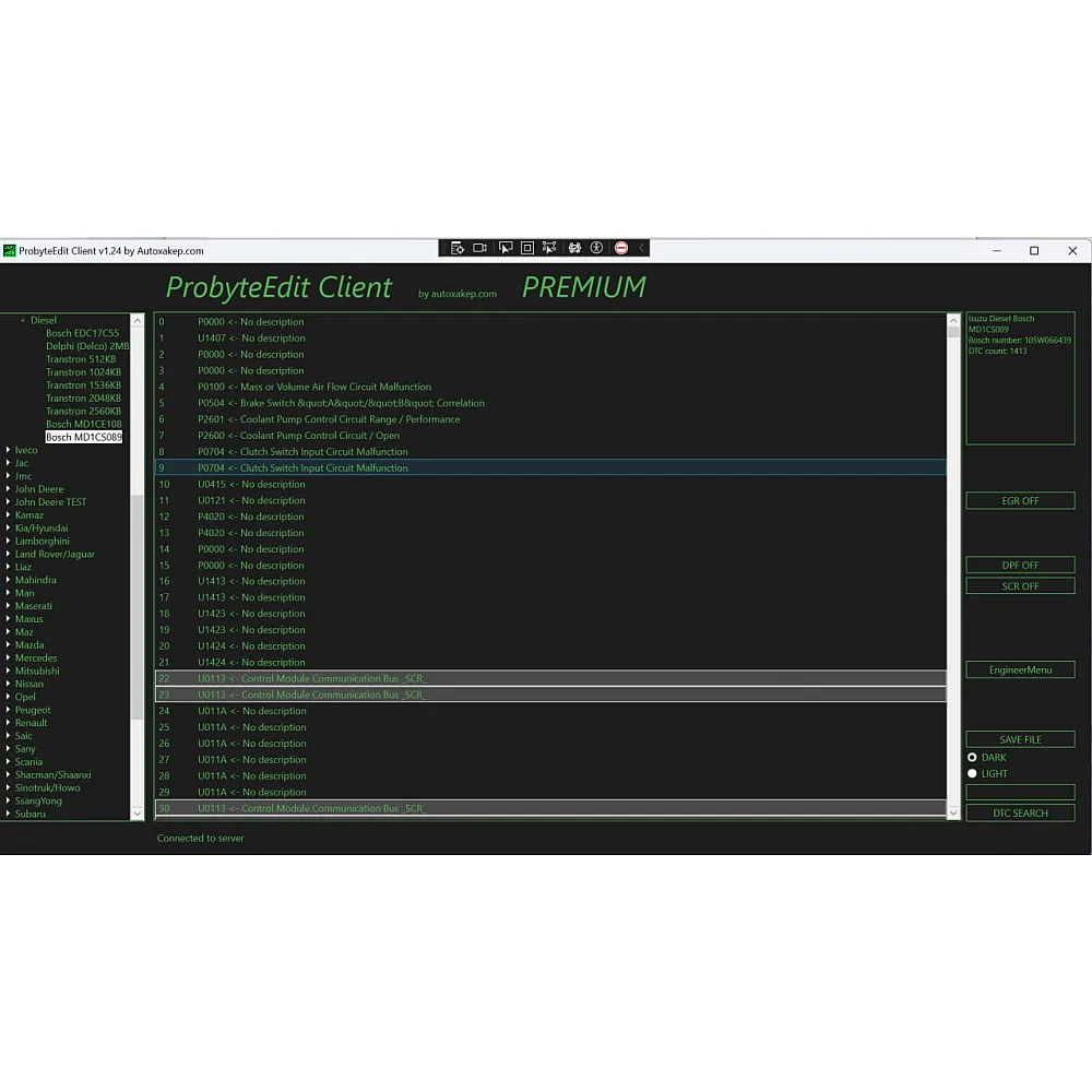 Probyte Edit Isuzu Diesel MD1CS089 — это программное обеспечение для обслуживания и диагностики дизельных двигателей Isuzu с системами EGR, DPF и SCR. Лицензия позволяет проводить комплексное тестирование, настройку и устранение ошибок (DTC OFF), обеспечивая оптимальную работу двигателя и снижение расхода топлива. Подходит для профессионалов в автосервисах и мастерских.