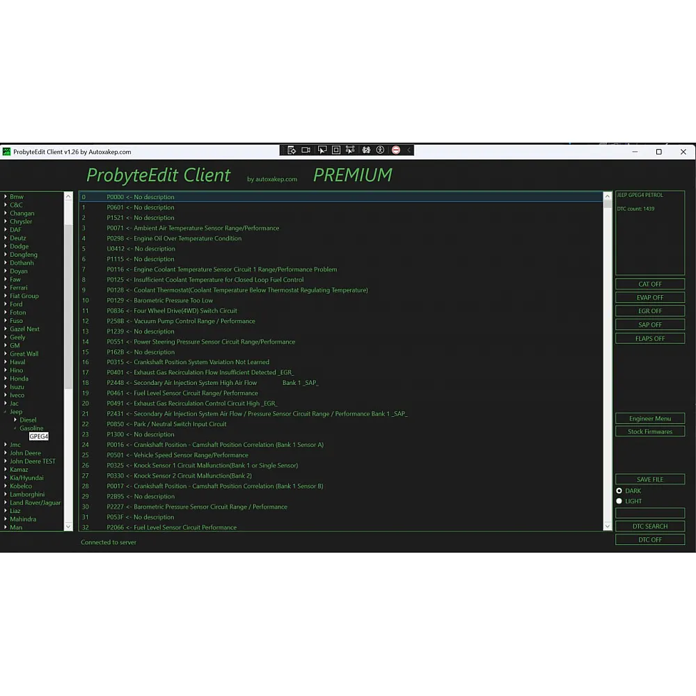Probyte Edit JEEP GPEG4 PETROL CAT EVAP EGR SAP FLAPS — это лицензионное программное обеспечение, предназначенное для настройки и адаптации электронных блоков управления (ЭБУ) автомобилей Jeep с бензиновыми двигателями. Продукт позволяет оптимизировать работу систем катализатора (CAT), испарения (EVAP), рециркуляции выхлопных газов (EGR), а также управления заслонками (SAP FLAPS). Подходит для профессионального использования в автосервисах и мастерских, занимающихся чип-тюнингом и настройкой электронных систем автомобилей.