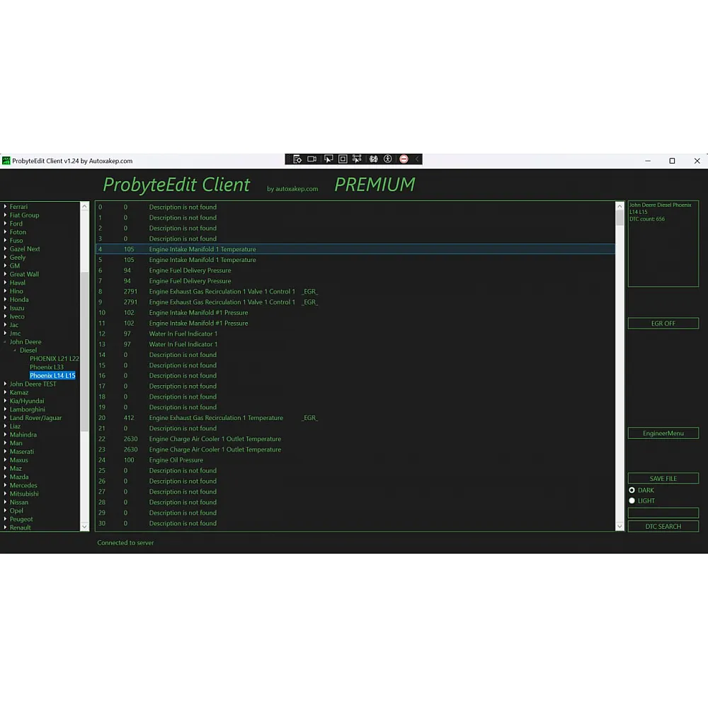 Probyte Edit John Deere Diesel Phoenix L14 L15 EGR DTC OFF — это лицензия на программное обеспечение, которое предназначено для работы с дизельными двигателями John Deere. С её помощью можно эффективно редактировать параметры, связанные с системами EGR и DTC, что позволяет оптимизировать работу двигателя и улучшить его характеристики. Подходит для профессионального использования в автосервисах и мастерских, специализирующихся на ремонте и обслуживании техники John Deere.