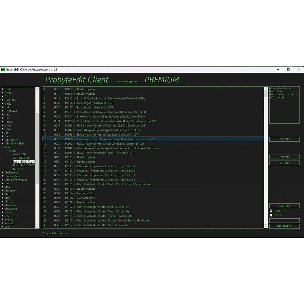 Probyte Edit Kamaz (Compas 9) Diesel Bosch EDC17CV44 EGR DPF DTC OFF — это лицензия для профессионального оборудования, которая позволяет работать с программным обеспечением Probyte Edit для диагностики и настройки дизельных двигателей КамАЗ с системой управления Bosch EDC17CV44. Поддерживает функции EGR, DPF, DTC OFF, что необходимо для точной настройки и оптимизации работы двигателя. Подходит для использования с диагностическим оборудованием Compas 9.
