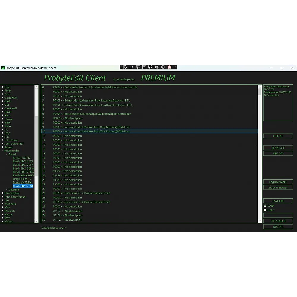 Probyte Edit Kia/Hyundai Diesel Bosch EDC17C08 EGR DPF FLAPS DTC OFF — это программное решение для настройки и оптимизации электронных систем управления дизельными двигателями автомобилей Kia и Hyundai. Лицензия предоставляет доступ к функционалу, который позволяет работать с блоками управления Bosch EDC17C08, настраивать параметры EGR, DPF и FLAPS, а также отключать диагностические коды неисправностей (DTC). Продукт предназначен для профессиональных автомехаников и сервисных центров, специализирующихся на обслуживании и ремонте автомобилей указанных марок.