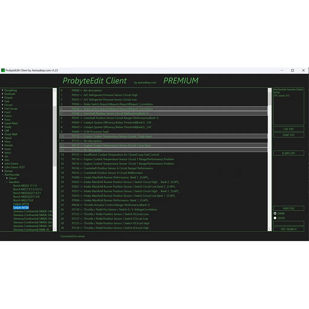 Лицензия Probyte Edit для Kia и Hyundai: работа с бензиновыми двигателями, Delphi MT86, CAT, EVAP, EGR, FLAPS, DTC OFF