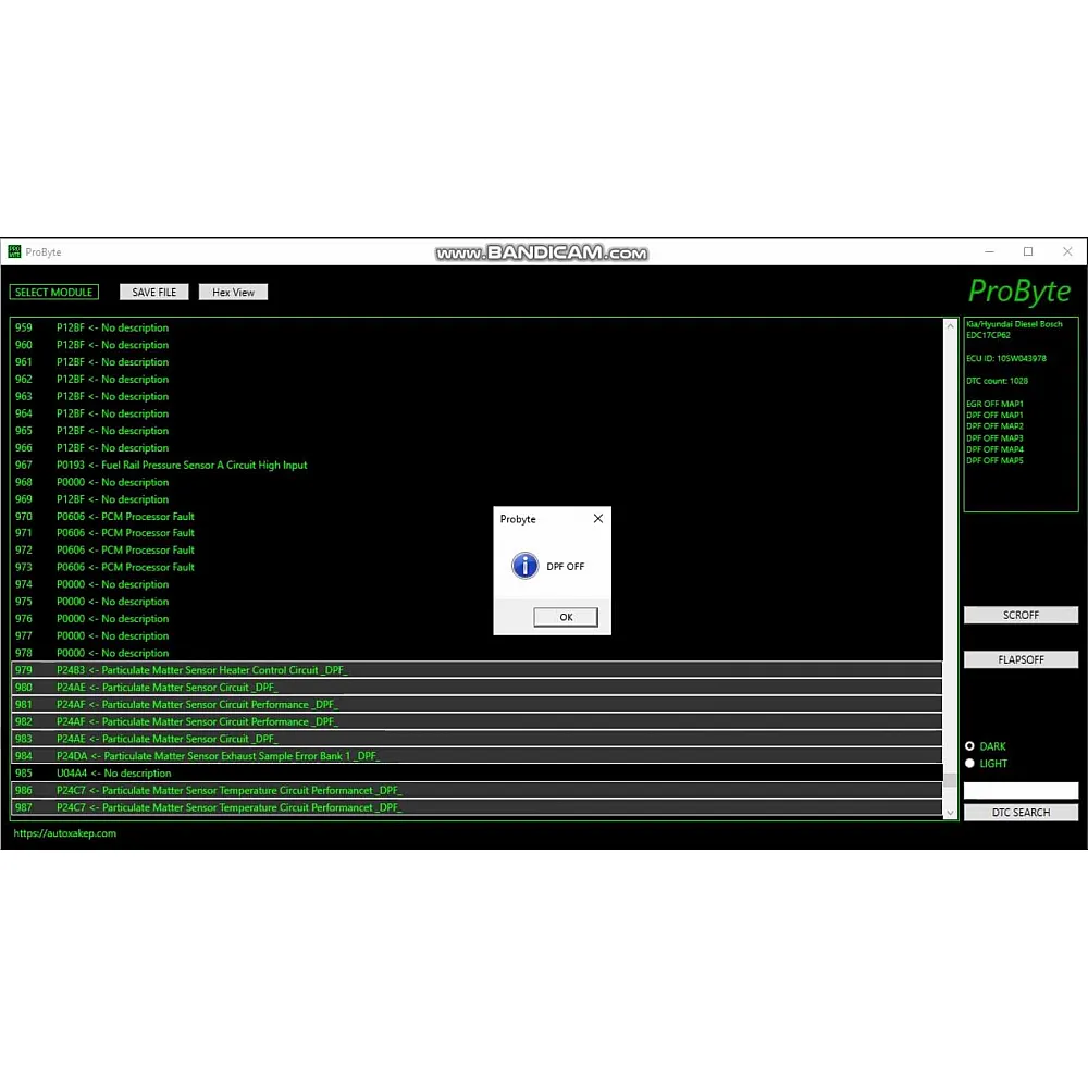 Probyte Edit Module FULL Kia/Hyundai Diesel Bosch EDC17CP62 EGR DPF SCR DTC off — это программное решение для настройки и модификации электронных систем управления двигателем автомобилей Kia и Hyundai с дизельными двигателями Bosch EDC17CP62. Модуль позволяет проводить глубокую настройку параметров двигателя, отключение систем EGR, DPF, SCR, а также очистку кодов ошибок DTC. Подходит для профессионального использования в автосервисах и мастерских, специализирующихся на обслуживании автомобилей Kia и Hyundai.