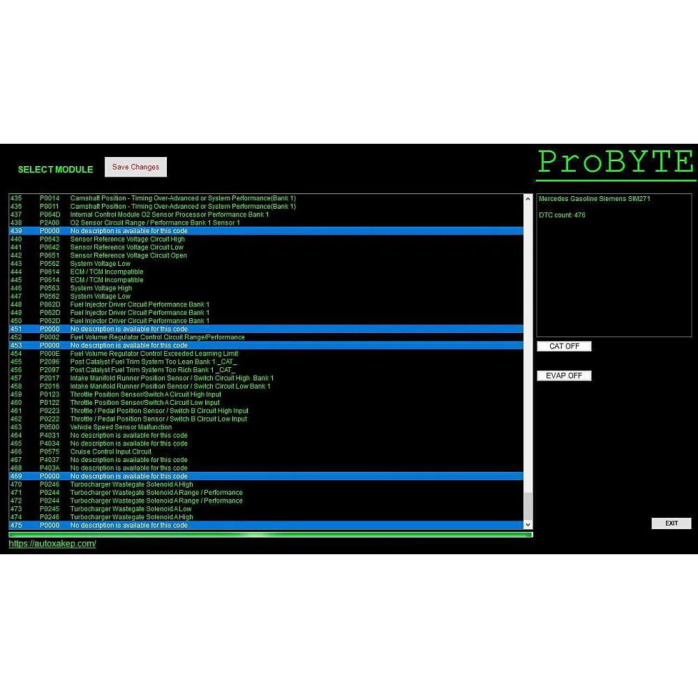 Probyte Edit Module FULL Mercedes Gasoline Siemens SiM271 CAT EVAP EGR DTC off — это программное решение для работы с автомобилями Mercedes с бензиновым двигателем, управляемым контроллером Siemens SiM271. Модуль позволяет проводить комплексную диагностику, настройку и обслуживание систем EVAP, EGR, а также отключать коды неисправностей (DTC). Подходит для профессионального использования в автосервисах и мастерских.