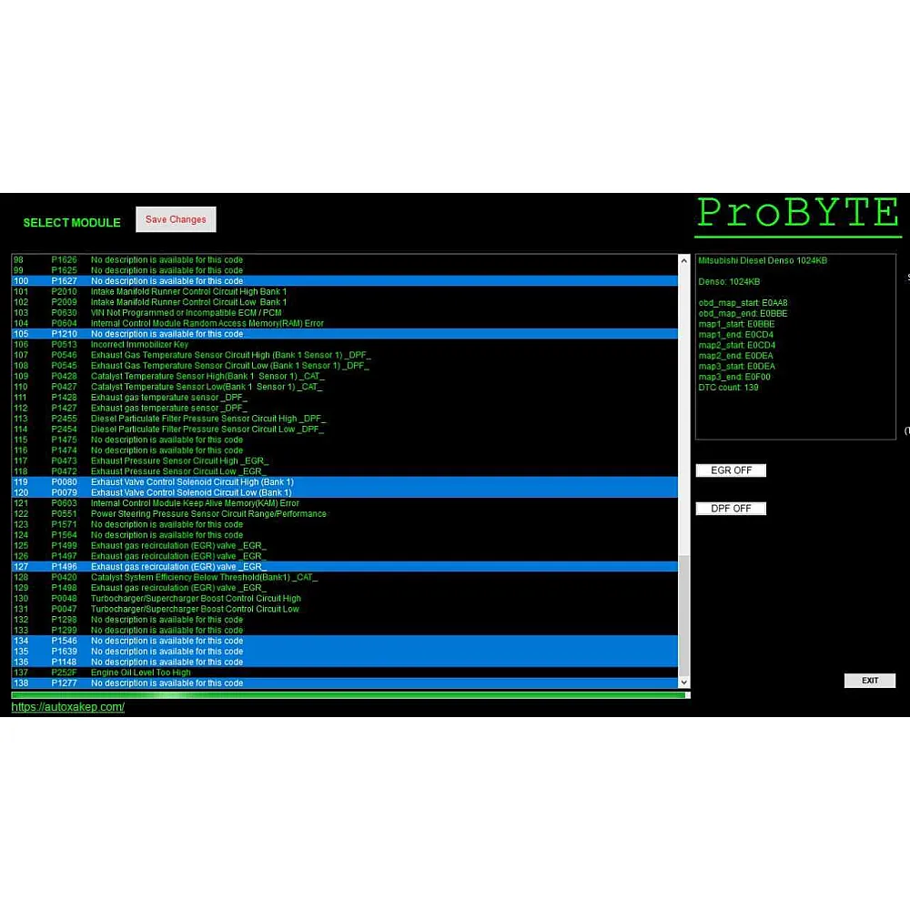 Probyte Edit Module FULL Mitsubishi Denso diesel DTC EGR DPF off 1024 kb — это программное решение для обслуживания и настройки дизельных двигателей Mitsubishi и Denso. Модуль позволяет проводить диагностику, адаптацию и настройку параметров работы двигателя, а также отключение систем EGR и DPF. Подходит для профессионального использования в автосервисах и мастерских.