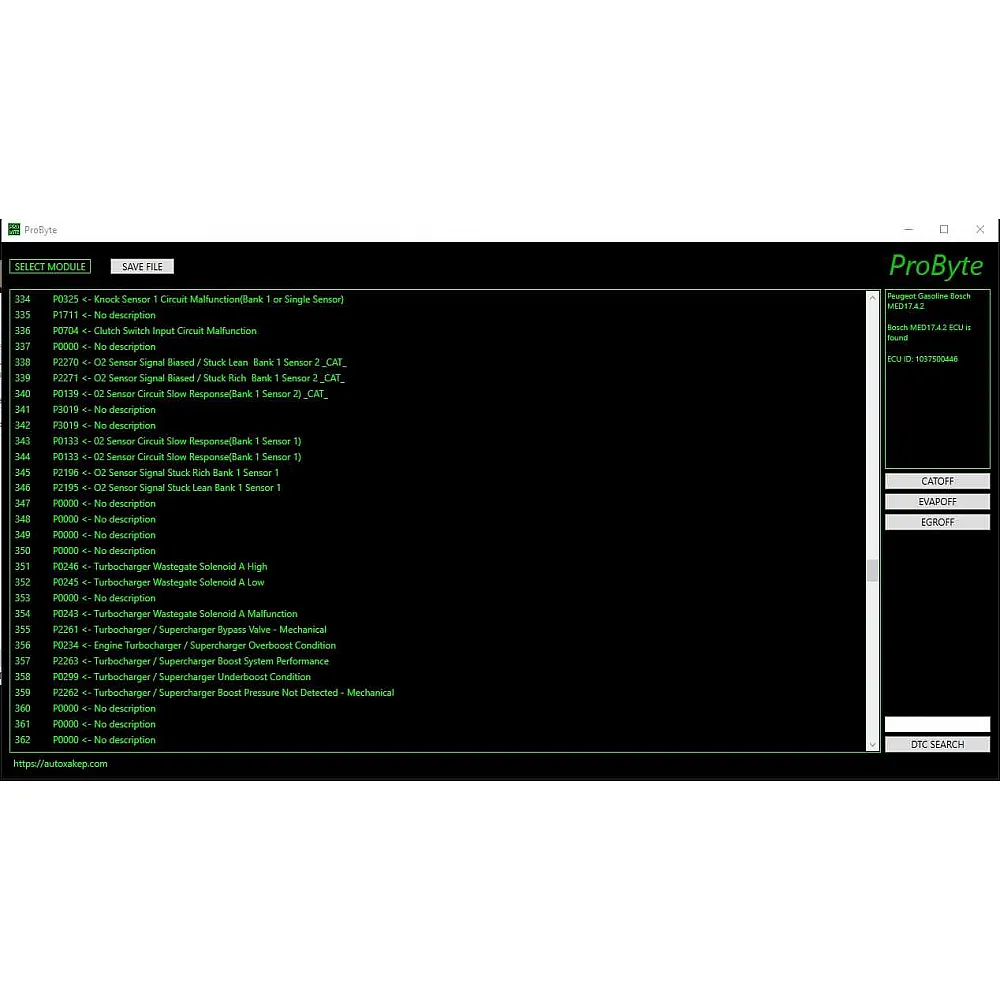 Probyte Edit Module Peugeot Gasoline Bosch MED17.4.2 CAT EGR DTC off — это программное решение для настройки и оптимизации электронных систем управления двигателем автомобилей Peugeot с бензиновым двигателем и блоком управления Bosch MED17.4.2. Модуль позволяет деактивировать системы CAT, EGR и DTC, что может улучшить производительность и отклик двигателя. Подходит для профессионального использования в автосервисах и мастерских.