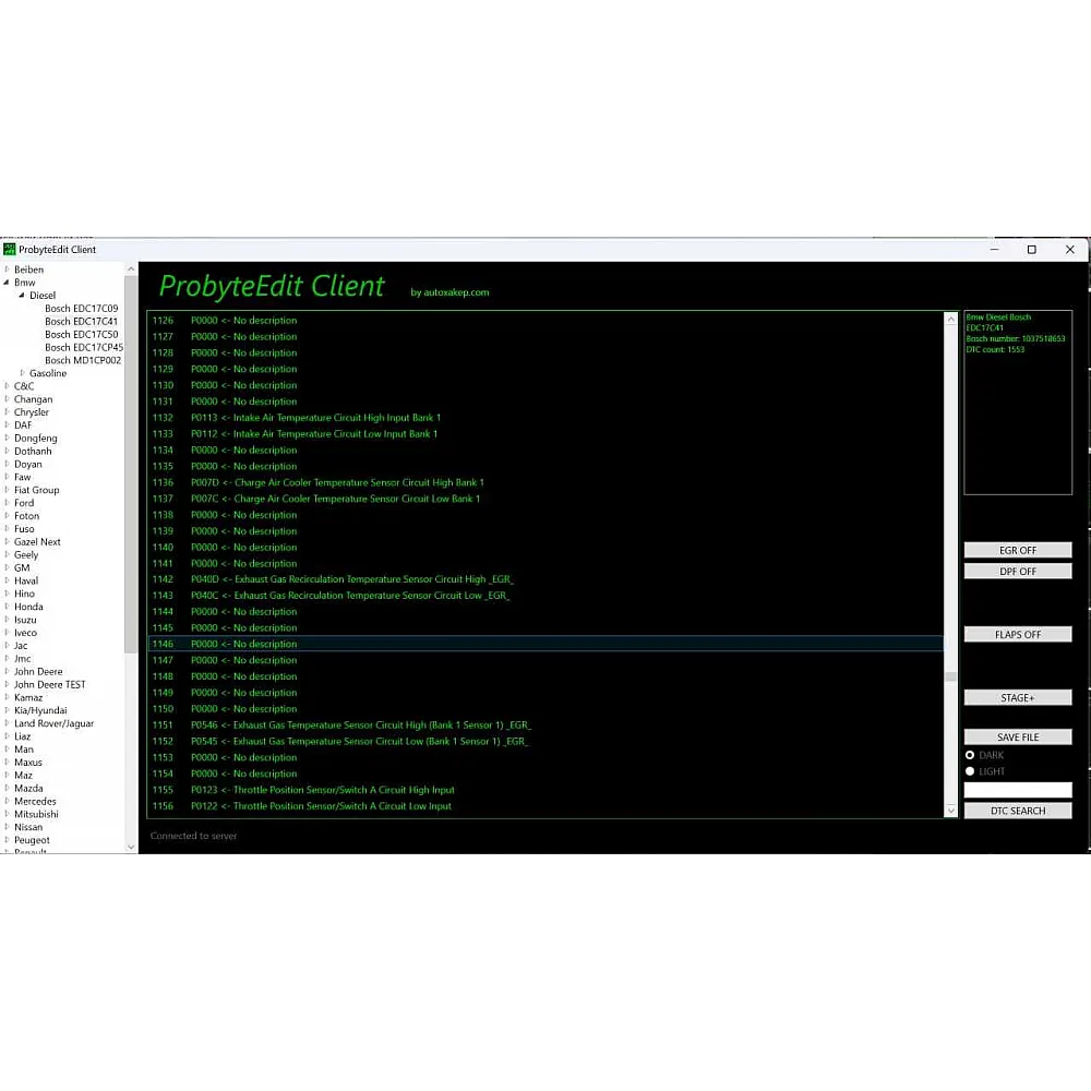 Probyte Edit Module ProByte BMW Diesel Bosch EDC17C41 EGR DPF FLAPS DTC off — это программное решение для настройки и оптимизации работы дизельных двигателей BMW с системой управления Bosch EDC17C41. Модуль позволяет деактивировать системы EGR (рециркуляция выхлопных газов), DPF (сажевый фильтр) и FLAPS (управление заслонками), а также отключать диагностические коды неисправностей (DTC). Подходит для профессионального использования в автосервисах и мастерских, специализирующихся на ремонте и настройке автомобилей BMW.