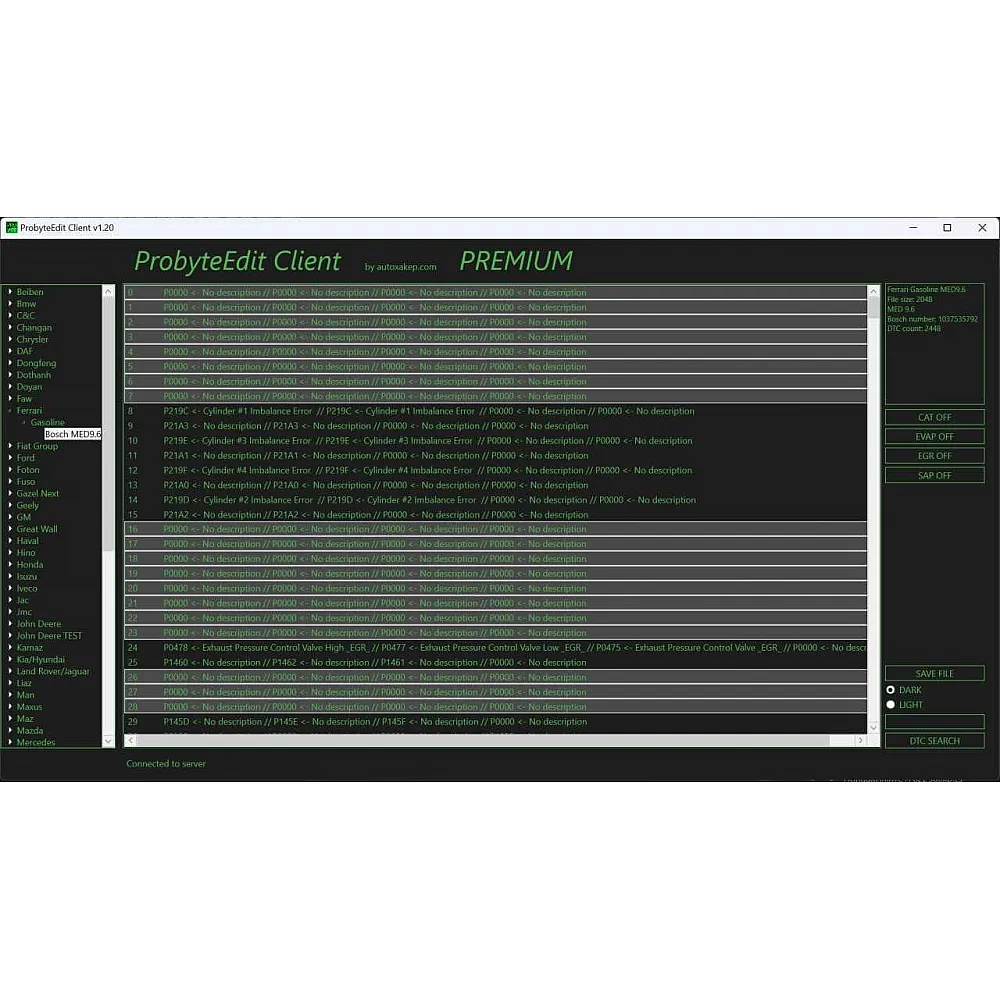 Probyte Edit Module ProByte Ferrari Gasoline MED9.6 CAT EGR EVAP SAP FLAPS DTC off — это программное решение для настройки и оптимизации работы электронных систем автомобиля Ferrari. Модуль позволяет проводить диагностику, адаптацию и ремонт систем управления двигателем, включая управление каталитическим нейтрализатором (CAT), клапаном EGR, системой улавливания паров топлива (EVAP), сажевым фильтром (SAP) и дроссельными заслонками (FLAPS). Также с помощью модуля можно отключать коды неисправностей (DTC).