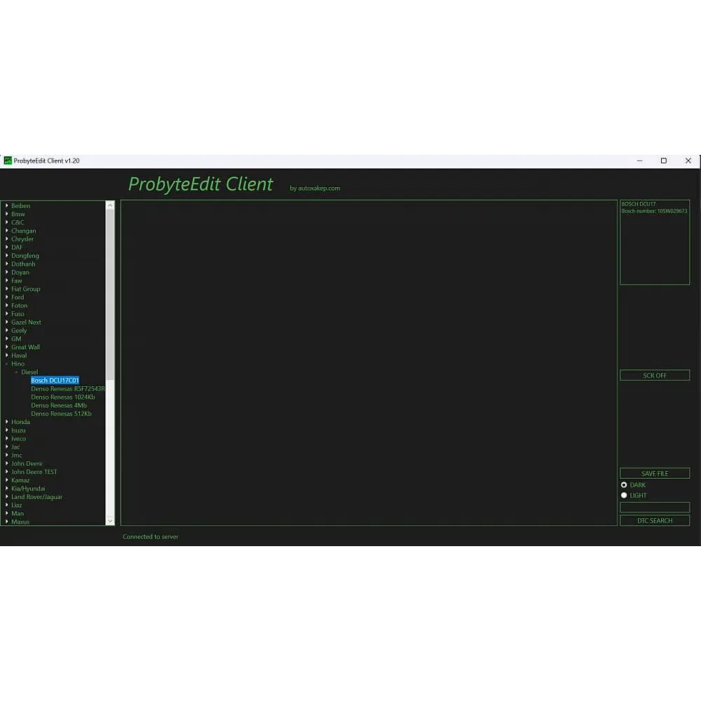Probyte Edit Module ProByte Hino Diesel BOSCH DCU17C01 SCR off — это программное решение для настройки и оптимизации работы дизельных двигателей Hino. Модуль позволяет проводить диагностику, адаптацию и редактирование параметров управления двигателем, что обеспечивает более эффективную и надёжную работу транспортного средства. Подходит для использования с контроллером BOSCH DCU17C01 и поддерживает отключение системы SCR. Идеально подходит для профессиональных автосервисов и владельцев транспортных средств, желающих улучшить характеристики своих автомобилей.
