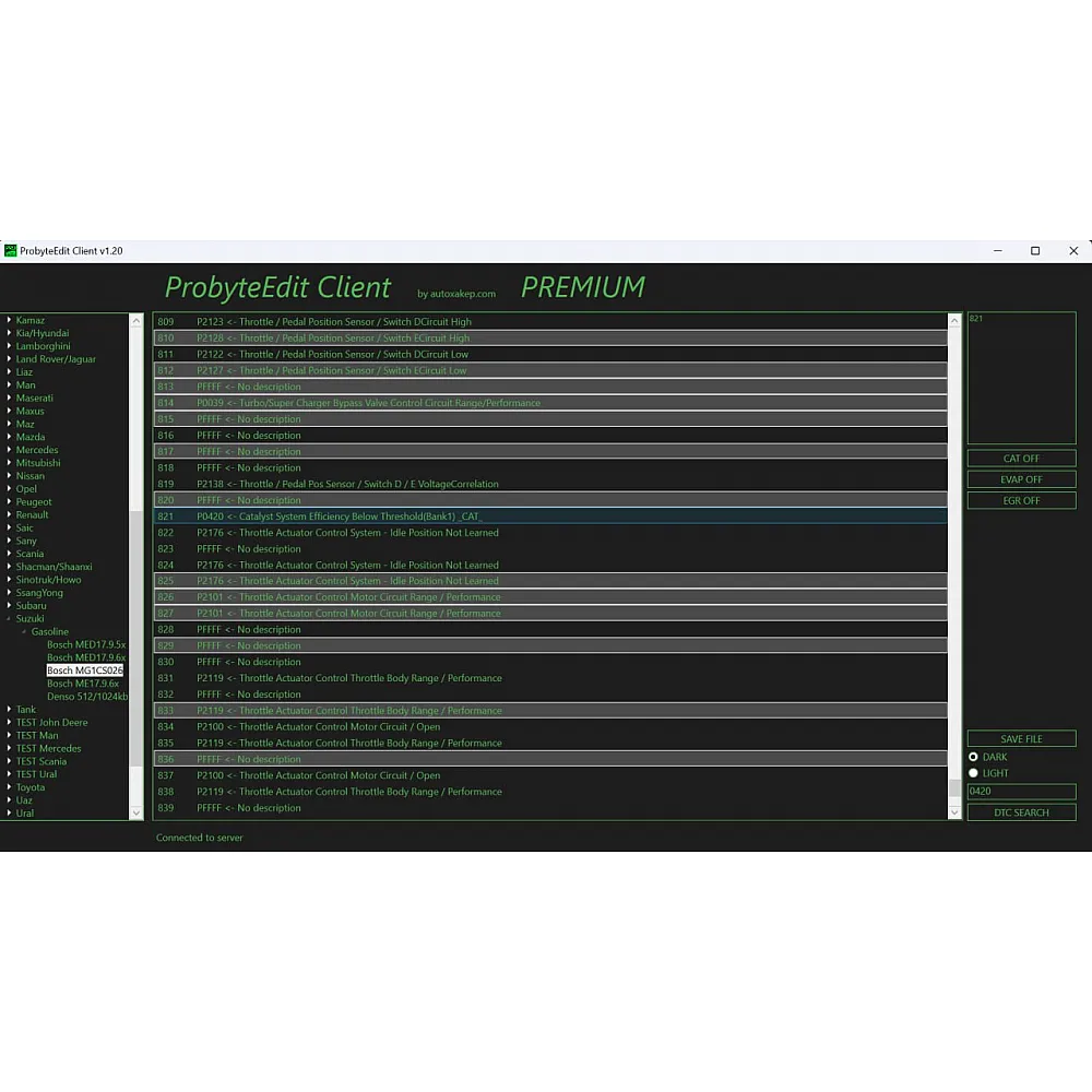 Probyte Edit Suzuki Gasoline Bosch MG1CS026 CAT OPF OGF EGR EVAP FLAPS DTC OFF — это программное обеспечение для настройки и диагностики автомобилей Suzuki с бензиновыми двигателями. Оно совместимо с диагностическим оборудованием Bosch MG1CS026 и позволяет работать с системами катализаторов (CAT), сажевых фильтров (OPF), рециркуляции отработавших газов (EGR), испарения топлива (EVAP), а также управления заслонками (FLAPS) и отключения диагностических кодов неисправностей (DTC OFF).